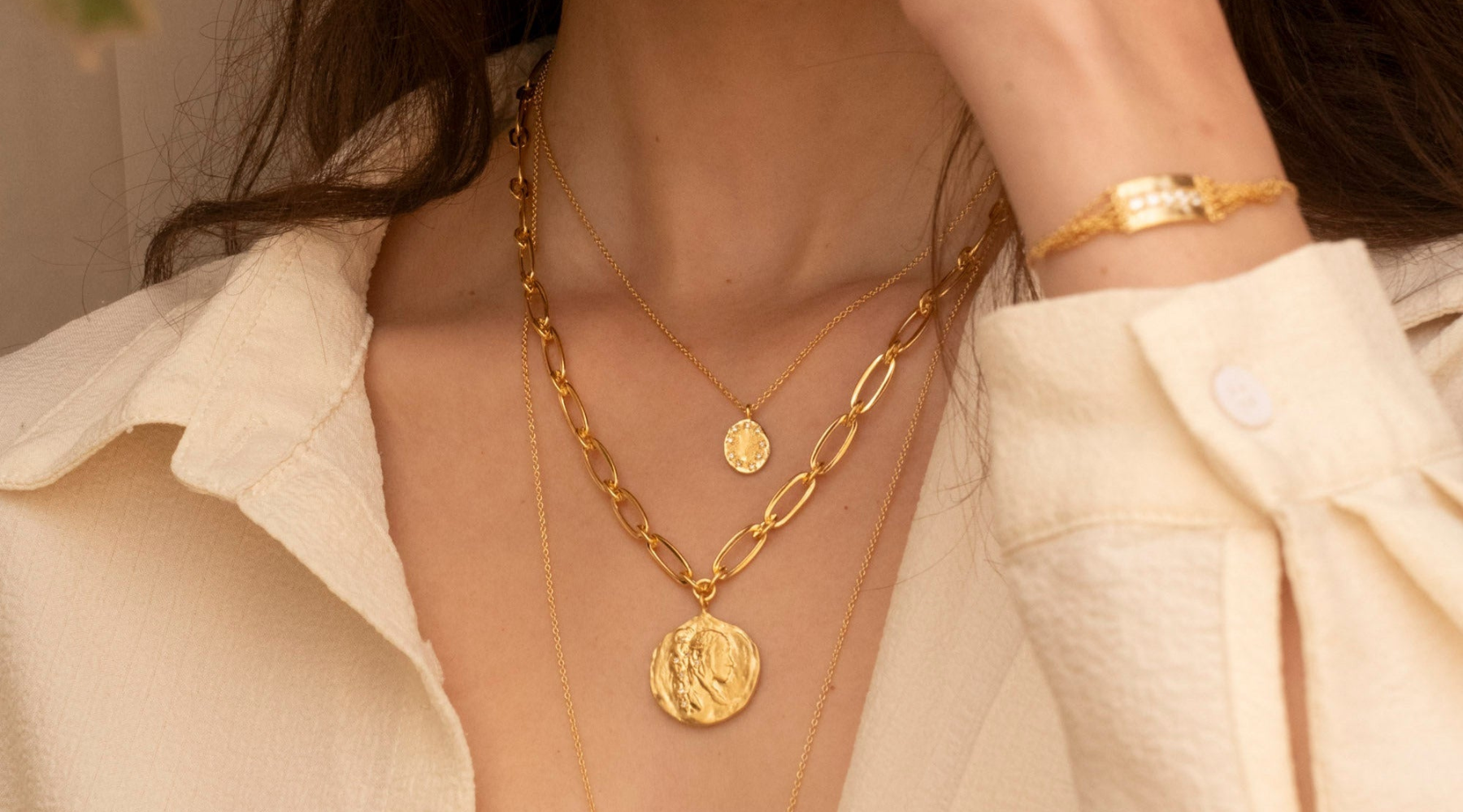 Les bijoux, bagues, colliers, bracelets, médailles se parent de laiton plaqué or, parfois sertis de pierres semi-précieuses ou de zircons, mêlant robustesse et délicatesse à la fois.